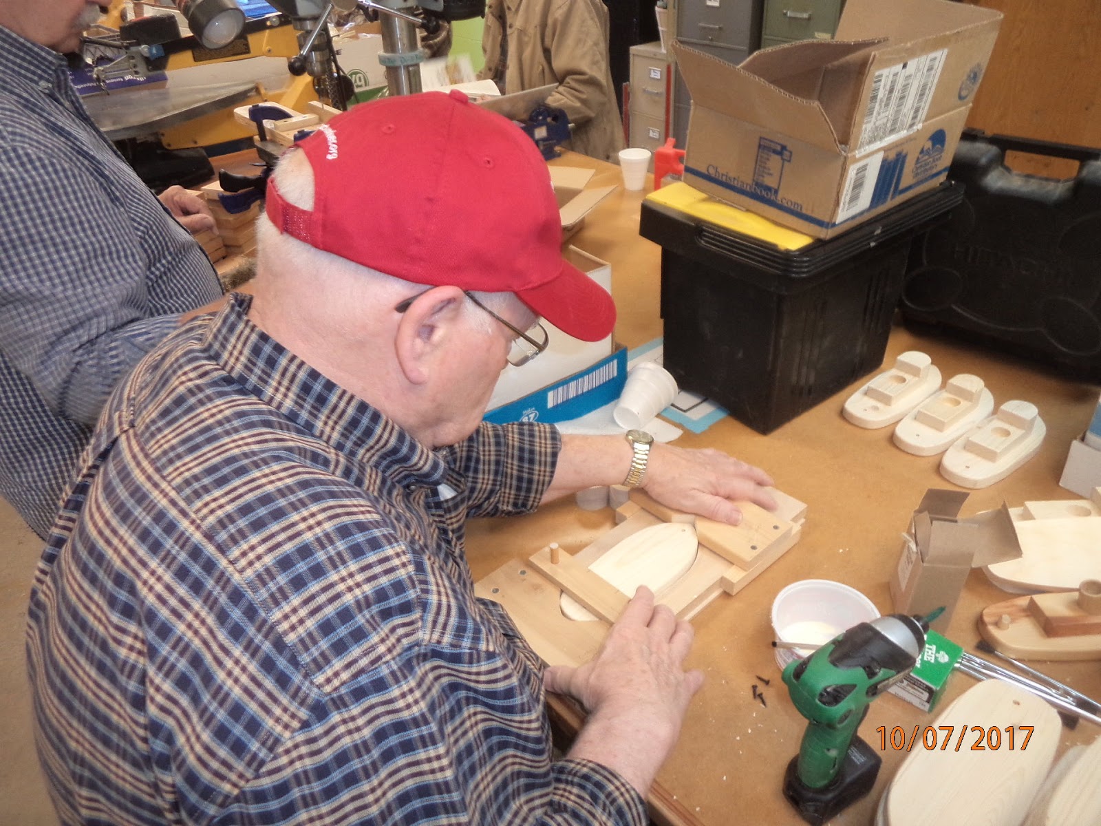Today was the warmest day of the week, over 70 degrees, so it was still warm enough to set up routers and sanders outside.  Today was a building day.  We continued the process started last weekend of building tugboats.  We finished up parts for basketball games, started assembling the bases, and traced out about 200 Love Bugs.  There were no toys completed for moving to storage/inventory today.  Sorry Rick, I won today.