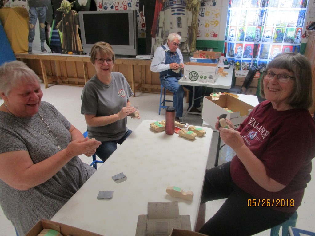 toymaking is making toys for giving to kids at Community events. Our next community event is a fundraiser called the Kenadi Carnival to be held in Spearfish on June 23rd. This past week, Mary Green cut over 300 blanks, drilled the windows and brought them to the workshop today. A team of toymakers drilled axles, routered edges, and sanded the flat sides to prepare them for giving. Some additional sanding will be needed to complete all the blanks. Mary will be finishing them at home.