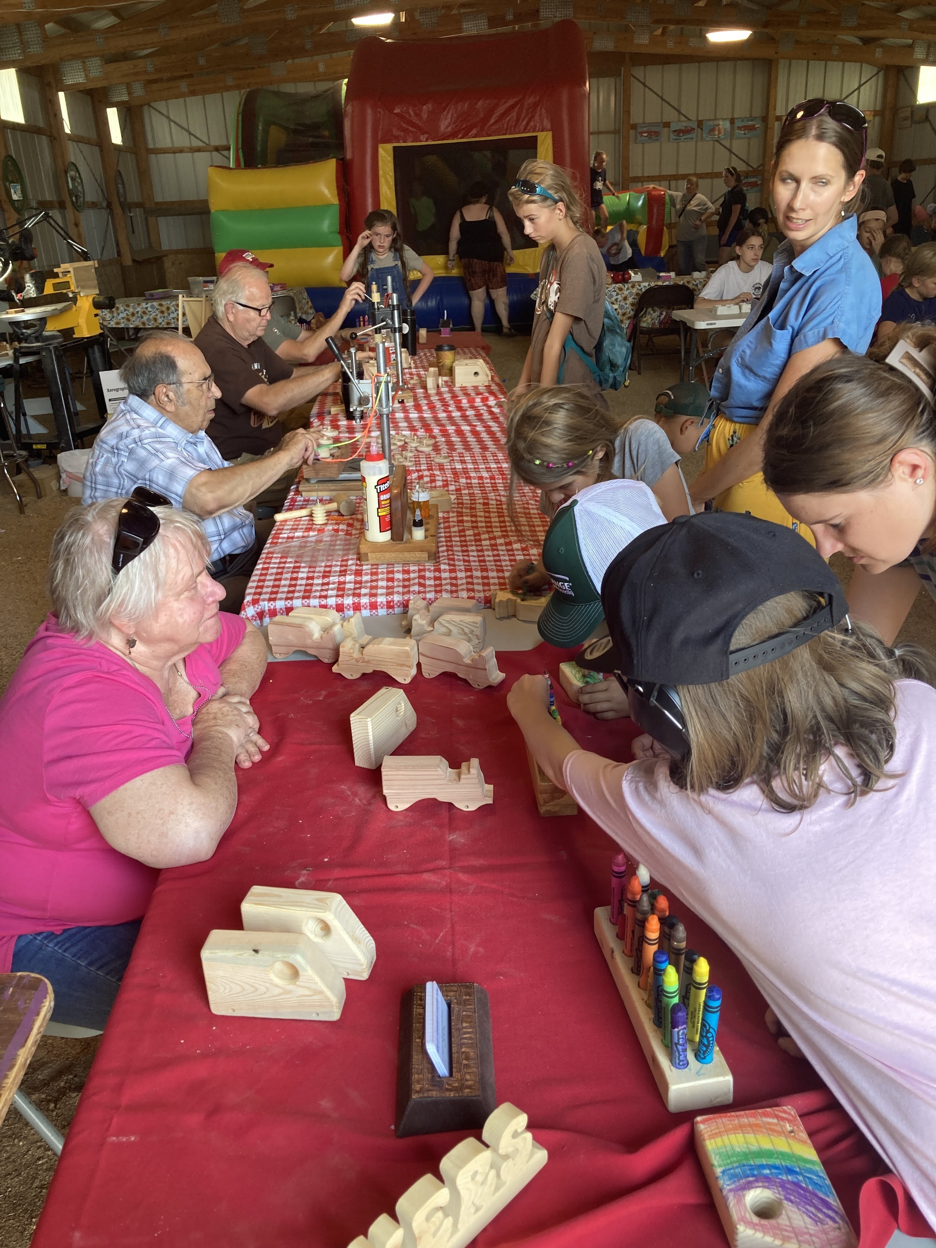 The RCWA toymakers set up in the Memorial Building at the Sturgis Threshing Bee on August 19, 2023 at 8:30 am. The temperature was in the low 70's at the start of the day with a strong wind from the north. It warmed up to 85 degrees by 4 pm.